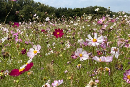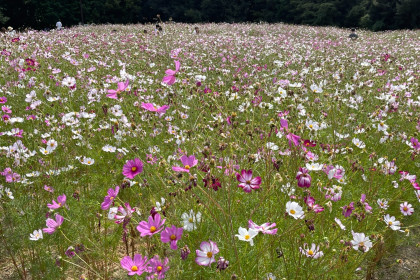 丘一面に咲いているコスモスを見ながら季節に触れる休日を。