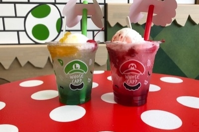 マリオカフェでは、ソーダを頂きます。こちらは、マリオ(ベリー系)ルイージ(青りんご)のお味を楽しむ事が出来ます。