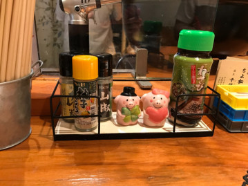 カウンター上の「味変アイテム」も充実、手前の黒いお皿に少量盛り付けて食します。