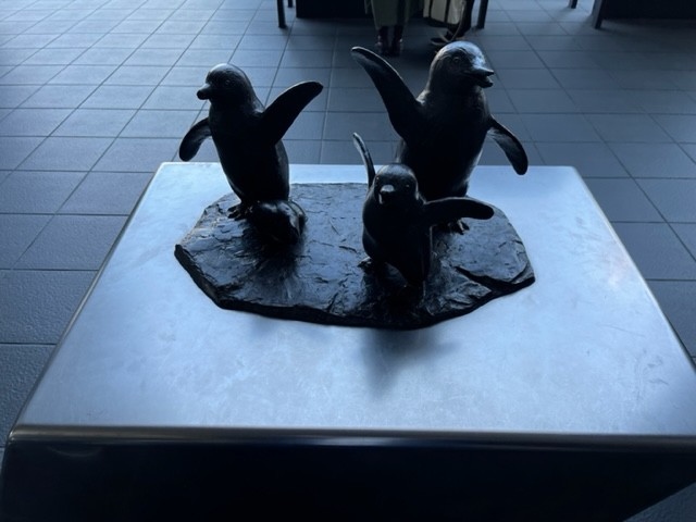 見たところケープペンギンの像のようです。京都水族館では「推し」はオオサンショウウオですが、駅前ではペンギン推しのようです。