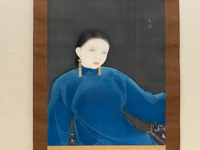 気だるく、たゆたう感じを全面に出して青いチャイナドレスをまとい少し眠たそうな印象を受けます。二重は大きくアイシャドウが塗られ、肌は黒田泰蔵さんの白い陶器のよう。