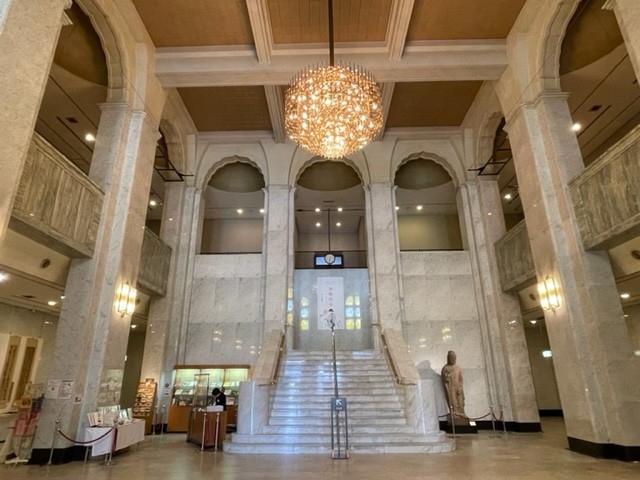 吹き抜けの大ホールは日本の近代建築では意外に珍しいクリスタルガラスの大シャンデリアが飾られています。