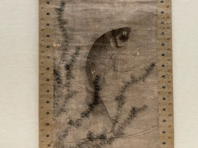 中国では一般的に「魚」がやたらとメデタイらしいということで、水墨画の始まりと共に中国で盛んになった「藻魚図」の流れをくむ作品です。さかなは余と発音して「有余」を意味して余裕があり裕福さを意味したり、一方で古代歌謡においては、恋人の意味をあらわすなど様々な寓意があったようです。