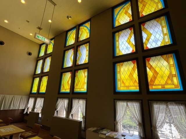 窓のステンドグラスも絵柄のない幾何学模様の色ガラスとなっていて日光が差し込み館内を明るく照らします。