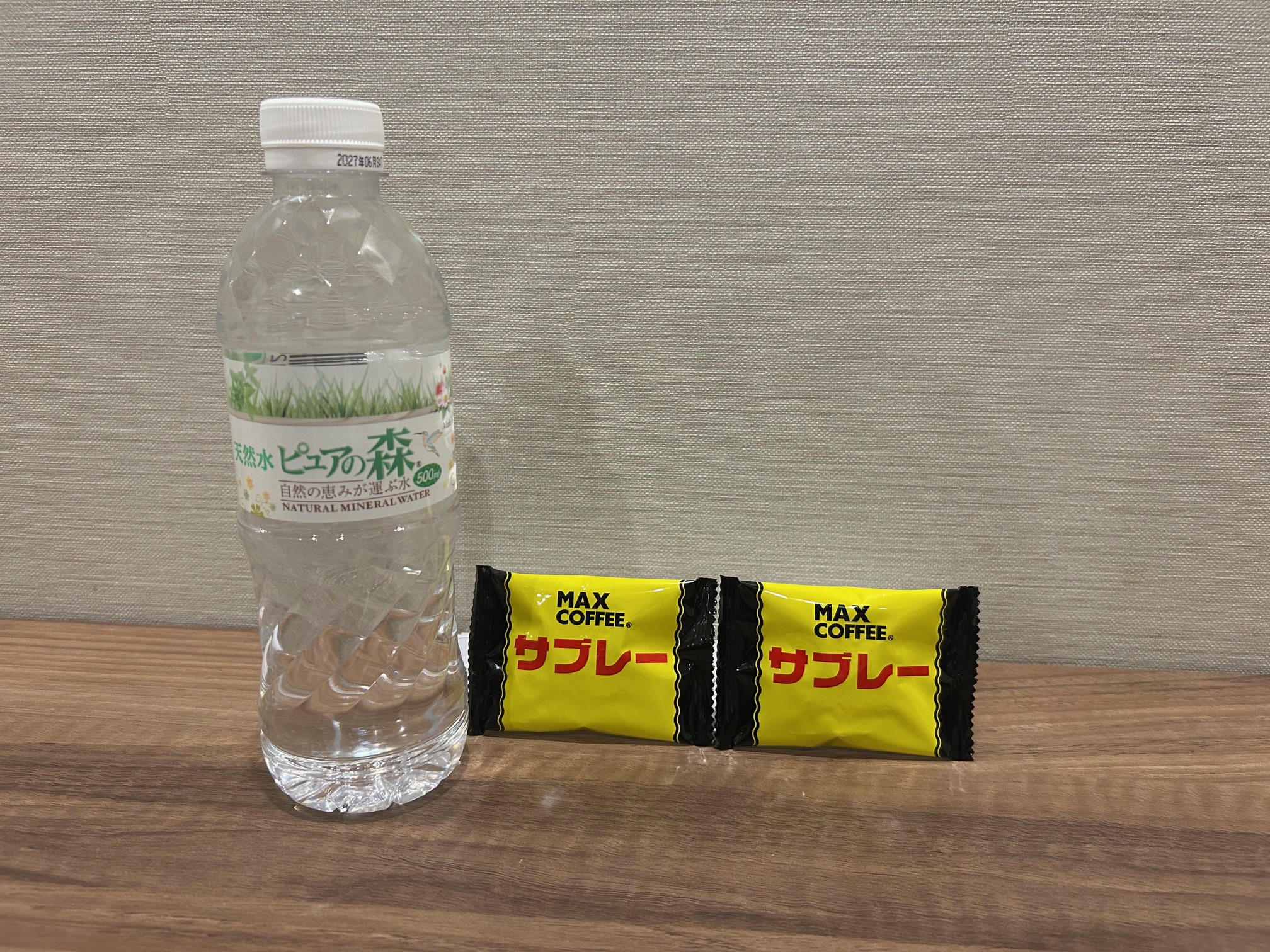 チェックイン時、「天然水ピュアの森」500mlペットボトルと「MAX COFFEE サブレ」をお渡しいたします。