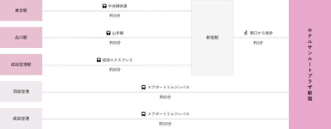 | アクセス方法 | ●︎ 公共交通機関の場合 JR新宿駅南口より徒歩3分 / 新宿駅甲州街道改札口より徒歩3分 地下鉄都営大江戸線新宿駅・A1出口(マインズタワー出口)より徒歩1分 バスタ新宿より徒歩3分 ●︎ 空港リムジンバス 羽田空港:約60分 / 成田空港:約120分 |